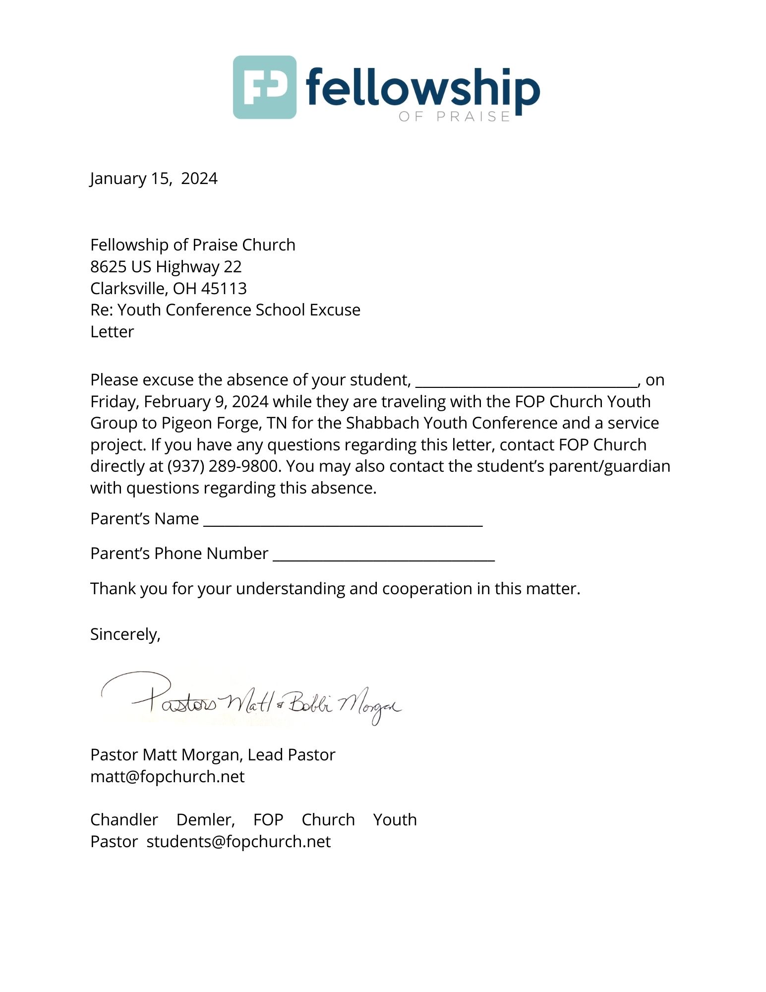 Every minor that will be attending Shabbach with FOP YTH must have a Medical Release Form filled out and turned in to Pastor Chandler by Sunday, February 4!